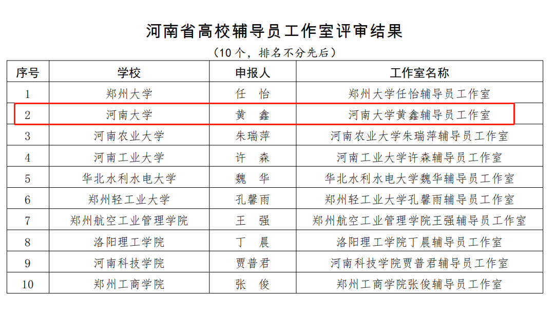 近日,河南省委教育工委、河南省教育厅公布《关于河南省高校辅导员工作室评审结果的公示》,我校党委学生工作部组织申报的“乐鱼·体育(中国)官方网站黄鑫辅导员工作室”榜上有名。此次评选活动自今年7月启动,经各高校申报、资格审查、专家评审、综合评议等环节,评选出10个河南省高校辅导员工作室。