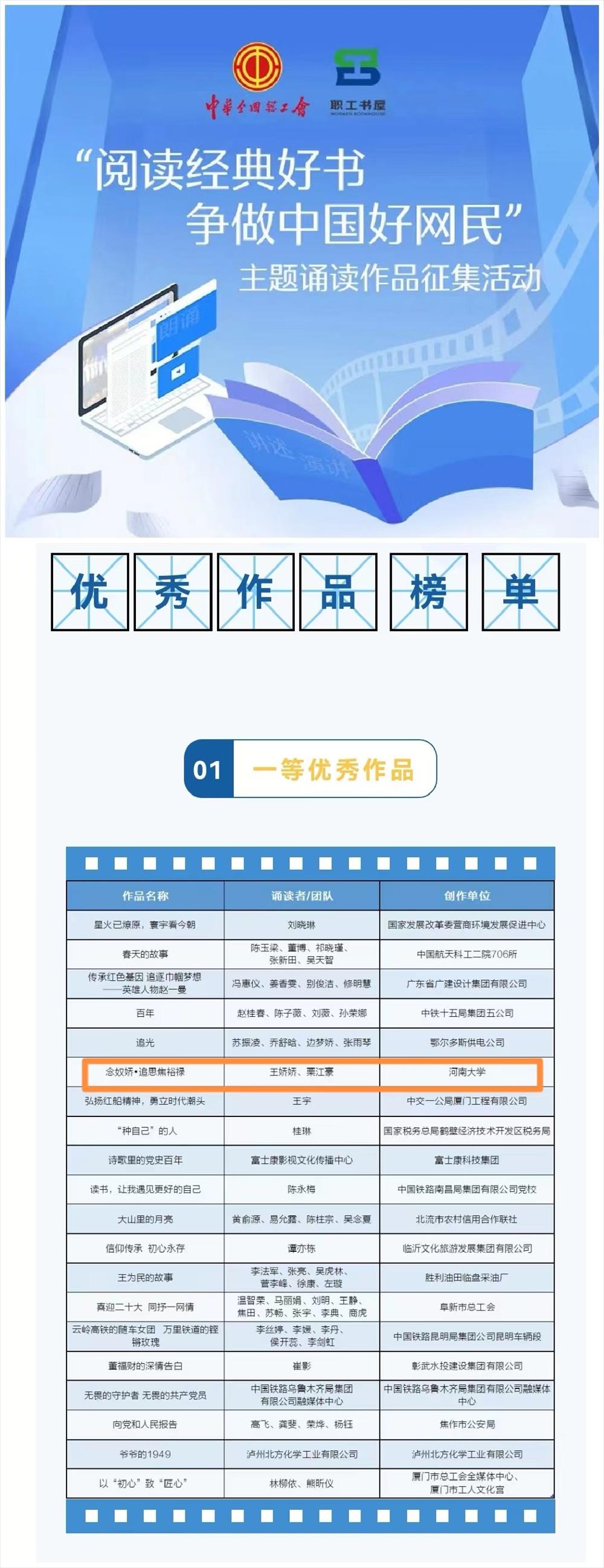 校工会选送的《念奴娇·追思焦裕禄》荣获本次全国主题诵读作品征集活动一等优秀作品。这是继我校选送的《念奴娇·追思焦裕禄》先后斩获开封市总工会、河南省教科文卫体工会、河南省总工会三个级别的职工经典诵读活动一等奖以来,第四次获得更高级别的一等奖,也是全国唯一获此殊荣的高校!