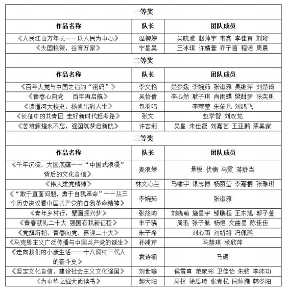 为深入贯彻落实习近平总书记关于“大思政课”的重要指示批示精神,坚持不懈用习近平新时代中国特色社会主义思想铸魂育人,引导学生深刻认识“两个确立”的决定性意义,增强“四个意识”,坚定“四个自信”,不断增强他们对思政课的获得感,以实际行动迎接党的二十大胜利召开,我校于2022年6月启动习近平新时代中国特色社会主义思想大学习领航计划主题教育活动。活动开展期间,我校学生广泛参与,经个人申报、主办单位组织专家评审,现将获奖名单予以公布。