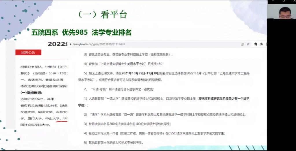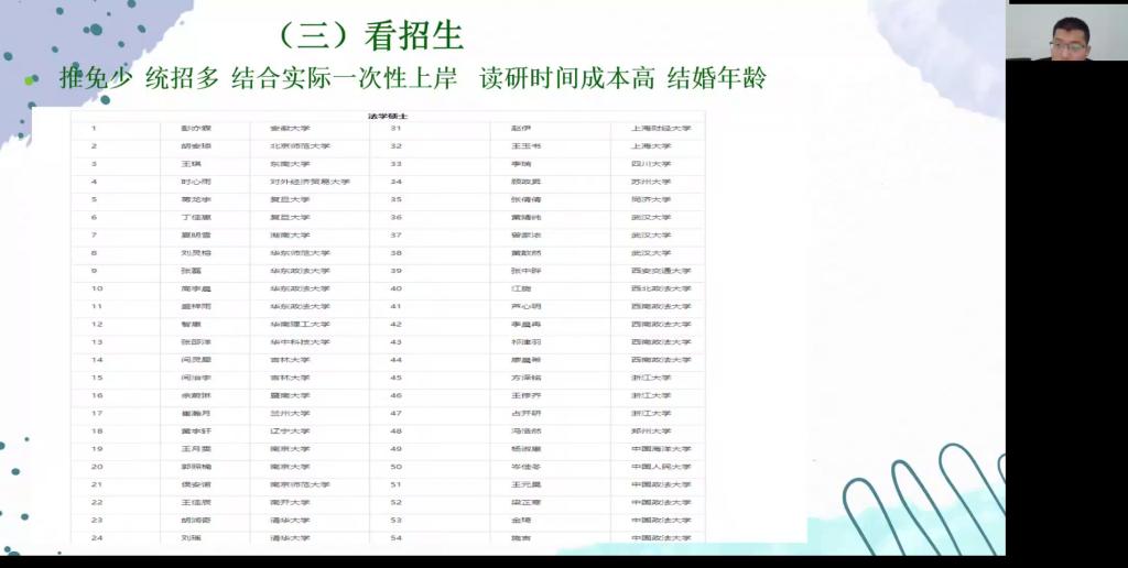 为帮助2023届本科毕业生对报考院校、专业做出合理选择,引导学生全面提升就业意识,树立合理就业期望,增强就业竞争力,9月22日下午,法学院以腾讯会议的形式召开2023届毕业生考研指导暨就业动员大会。法学院党委副书记吴瑷瑷,副院长刘夏,青年教师聂帅钧、许晏铭及法学院2023届全体本科毕业生参加会议,会议由法学院2019级辅导员赵亚楠主持。
