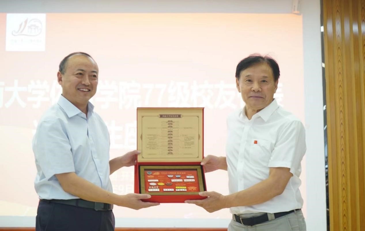 校友河南省教育厅体卫艺处原处长郭蔚蔚在讲话中回忆在校时的峥嵘岁月,诉说时光变迁,同时心系学院发展。他代表77级108名毕业学生表达对母校的关切,也希望老教师们能够心情愉悦,家庭和睦,健康幸福。