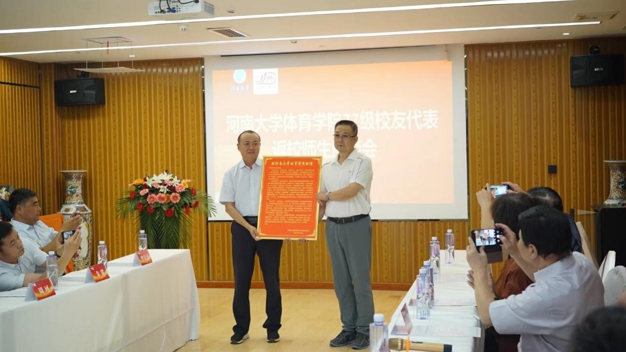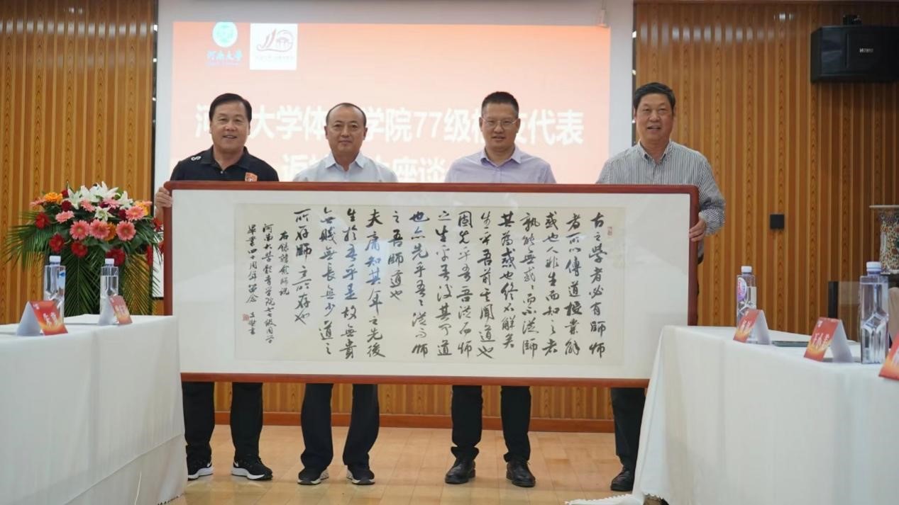 校友河南省体育局原副局长张跃敏、开封市教育体育局原副局长杨钊代表77级校友向体育学院赠送书法作品《师说》,感念师生情。校友郑州大学体育学院(校本部)原院长林克明、河南财经政法大学体育学院原院长崔伟和信阳师范学院体育学院原院长王小美向老教师们献上鲜花并赠送印有专门LOGO的纪念衫、纪念背包。段廷良代表体育学院向77级校友代表赠送乐鱼·体育(中国)官方网站110周年校庆专属纪念品徽章。
