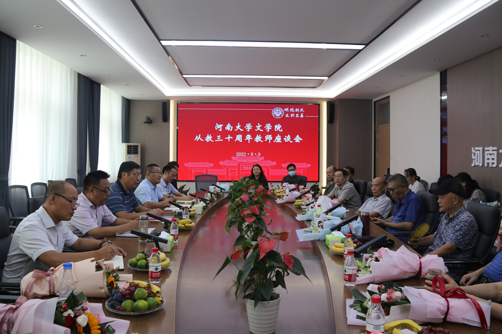 9月9日晚,文学院从教三十周年教师座谈会在二楼会议室召开。与会十几位教龄三十年及以上的教师纷纷分享了自己教学的心得体会以及对学院学科建设发展的建议。本次座谈会旨在于教师节来临之际对学院教师为学院发展作出的贡献与努力表达感谢与敬意。