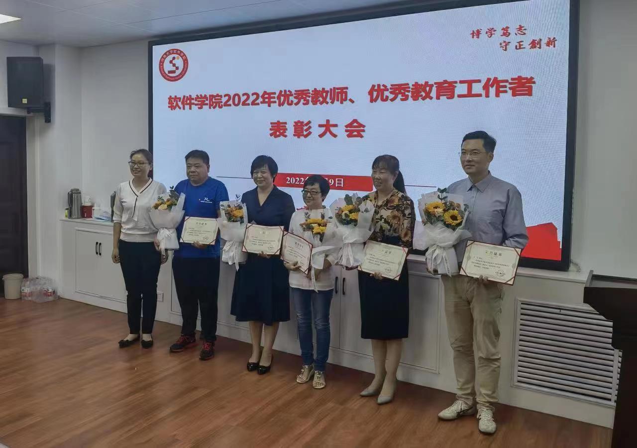院党委书记常继科向全院教职工致以节日的祝福和诚挚的问候,宣读了软件学院关于表彰2022年优秀教师和优秀教育工作者的决定,并向所有受到表彰的教师表示热烈的祝贺。张新红、李霞、王龙葛、程普、刘俊男获得“优秀教师”荣誉称号,左方、王趁平、李善治、李向敏、吕慧娟获得“优秀教育工作者”荣誉称号。
