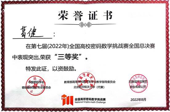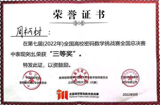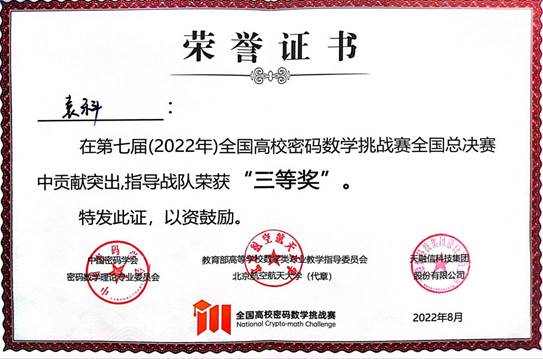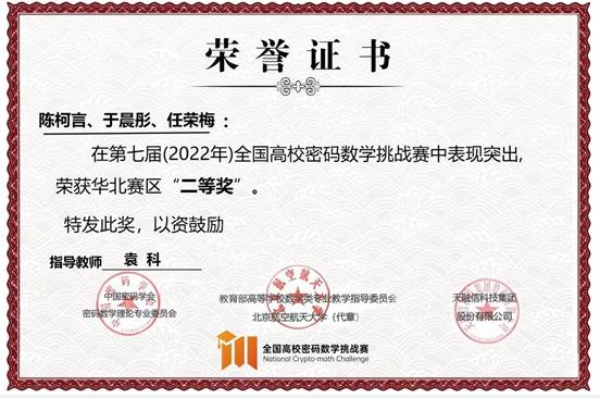 8月19日,第七届全国高校密码数学挑战赛总决赛在华中科技大学完美收官。乐鱼·体育(中国)官方网站计算机与信息工程学院共有7支队伍参赛,最终“SpecialRain”战队(队员:周柄材、葛健;指导教师:袁科)和“密码小白冲冲冲”战队(队员:陈柯言、于晨彤和任荣梅;指导教师:袁科)分别荣获全国三等奖和华北赛区二等奖的好成绩,实现了学院在该赛事上零的突破。