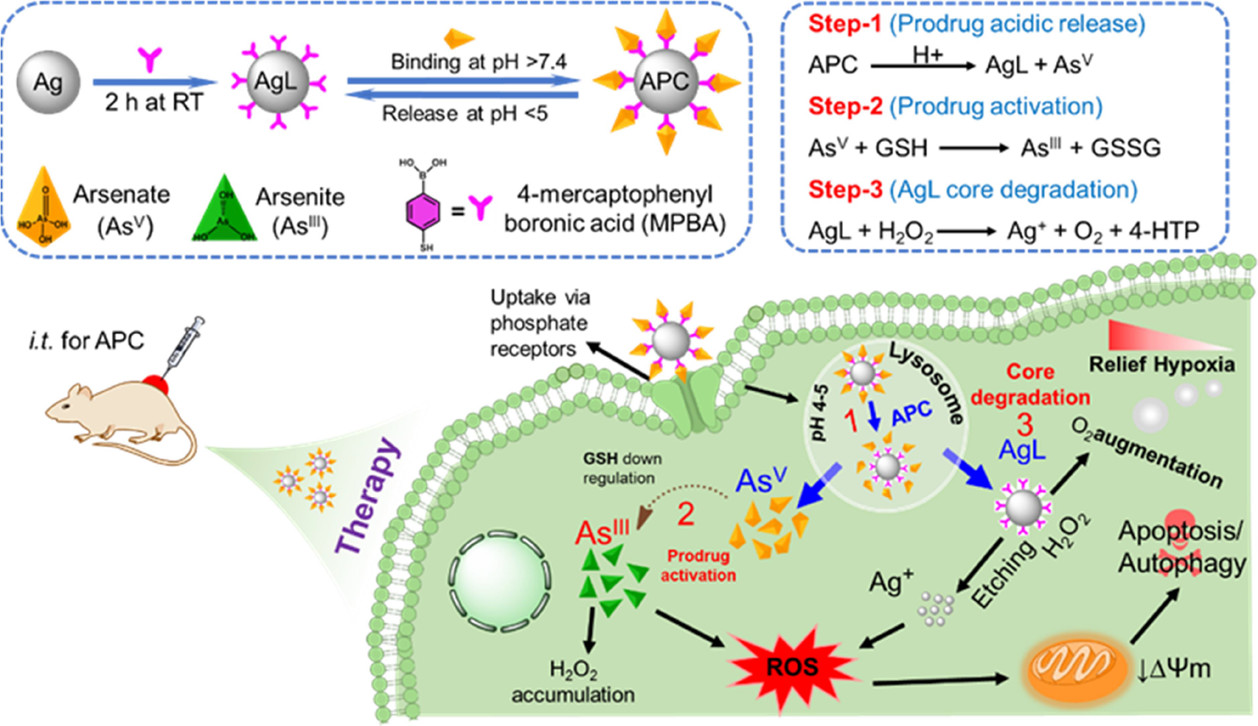 针对还原及乏氧的肿瘤微环境,实验室设计了一种由银纳米粒子及表面螯合的砷V组成的砷基纳米药物。其具有GSH应激释放及内涵体逃逸特性,能够通过抑制肿瘤细胞内的GPx及SOD,实现LC3自噬介导的细胞凋亡,进而有效抑制肿瘤细胞增殖。实验结果表明,砷基纳米药物在肿瘤治疗及原位检测方面有着巨大的应用前景。该成果发表在ACS Applied Materials & Interfaces 2022, 14, 32, 36487–36502(IF=10.383,SCI一区期刊)。博士研究生闫纪亮、博士后研究员Sumaira Hanif为该论文共同第一作者,吴海刚博士、Pir Muhammad博士为共同通讯作者。