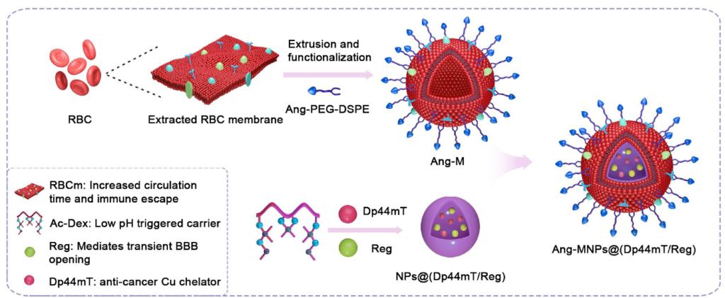 利用螯合剂2-(二-2-吡啶基亚甲基)-N,N-二甲基肼基硫代甲酰胺(Dp44mT)可选择性靶向癌细胞中高浓度的铜离子并产生大量活性氧(ROS)来杀伤肿瘤细胞这一特点,实验室将Dp44mT与血管扩张剂瑞加德松(Reg)共同装载到纳米粒子中,外部修饰靶向多肽Angiopep-2功能化的红细胞膜(Ang-M)。实验证明,该主动仿生纳米药物Ang-MNPs@(Dp44mT/Reg)可以有效穿越血脑屏障(BBB),主动靶向GBM病灶,且血液循环时间长,毒副作用低。U87MG-luc原位GBM模型小鼠实验表明,其能够有效抑制肿瘤生长并延长荷瘤小鼠的生存周期。该纳米递送系统还可拓展为一体化平台应用于脑部疾病的诊疗。该成果发表在Biomaterials 2022, 289, 121760(IF=15.305,SCI一区期刊)。博士后研究员Muhammad Ismail、研究生杨汶、李彦飞为该论文共同第一作者,冰洋教授、David B. Lovejoy教授为共同通讯作者。