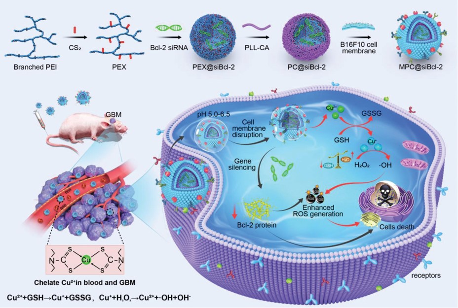 利用化学动力学疗法(CDT)具有无侵袭性和高响应性这一特点,实验室开发了以转移性黑色素瘤细胞膜为外壳、电荷转化赖氨酸为中间层、siRNA络合的聚乙烯亚胺黄原酸酯(PEX)为内核的仿生纳米药物。其可有效穿透BBB,PEX螯合肿瘤细胞中丰富的铜离子,不仅导致GSH的耗竭,而且生成能杀死肿瘤细胞的羟基自由基(·OH)。同时,抗凋亡蛋白Bcl-2的基因沉默导致ROS水平的增加,从而诱导GBM细胞凋亡级联反应。在皮下黑色素瘤和原位GBM肿瘤模型中均展现优异的治疗效果及延长的生存周期。该成果发表在Advanced Functional Materials 2022, 2209239(IF=19.925,SCI一区期刊),博士研究生张东亚为第一作者,冰洋教授、郑蒙教授和邹艳副教授为共同通讯作者。