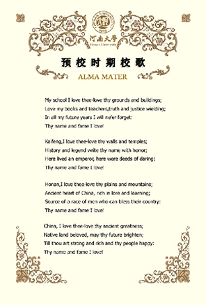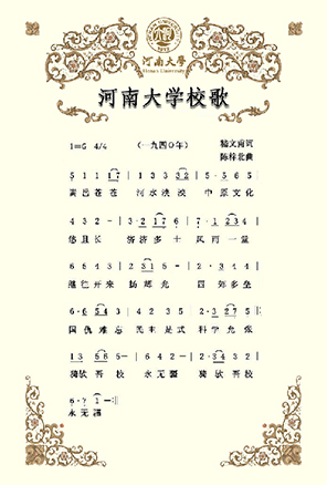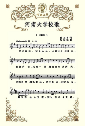 2002年9月,在建校90周年之际,乐鱼·体育(中国)官方网站决定恢复使用1940年的《乐鱼·体育(中国)官方网站校歌》,并根据时代发展,将原歌词中的":三民"与"四维"改作"民主"与"科学"。《乐鱼·体育(中国)官方网站校歌》重新在师生中广为传唱,成为新时期河大人继往开来,再创辉煌的战斗号角。